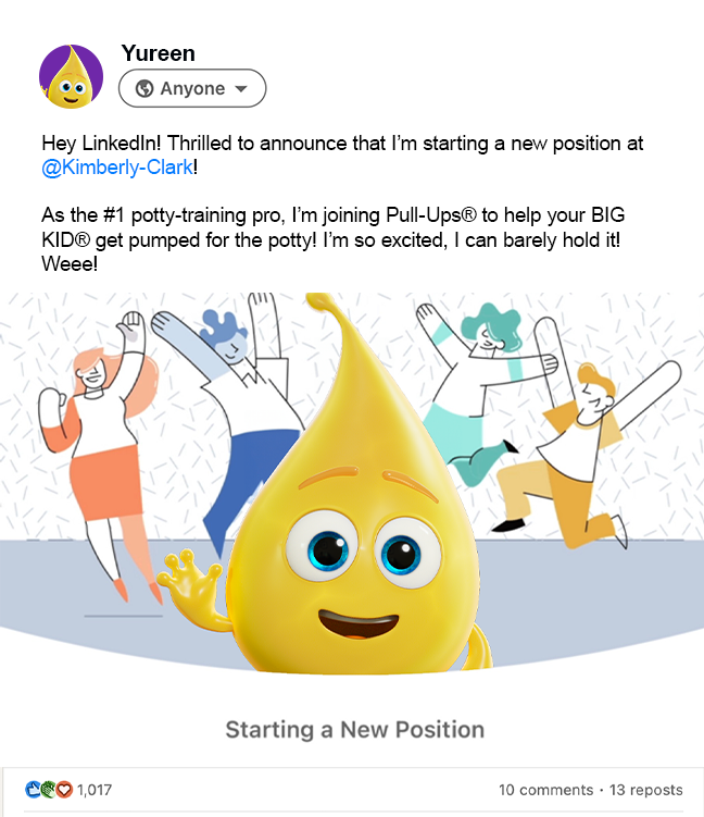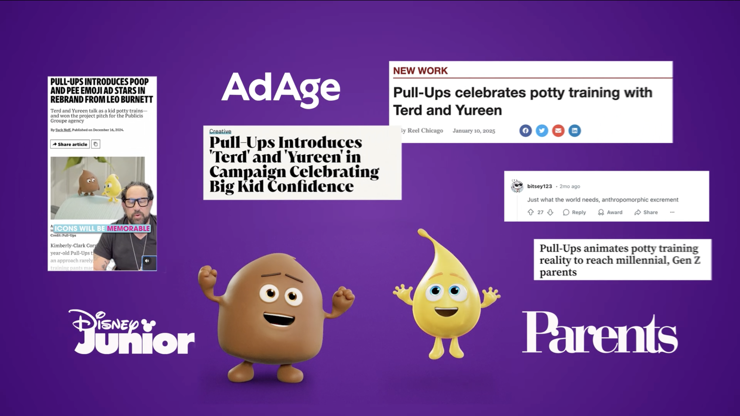 We hired the #1 and #2 potty-training pros, Terd & Yureen, to make Pull-Ups the potty-training brand. We dropped them everywhere from LinkedIn to plush toys, before bursting into the real world as slightly unhinged mascots. The Dave Matthews bridge? Check. The Brown and Yellow line? Of course. A back alley for some…craps? Naturally. All to build BIG KID confidence in parents and potty trainers alike.